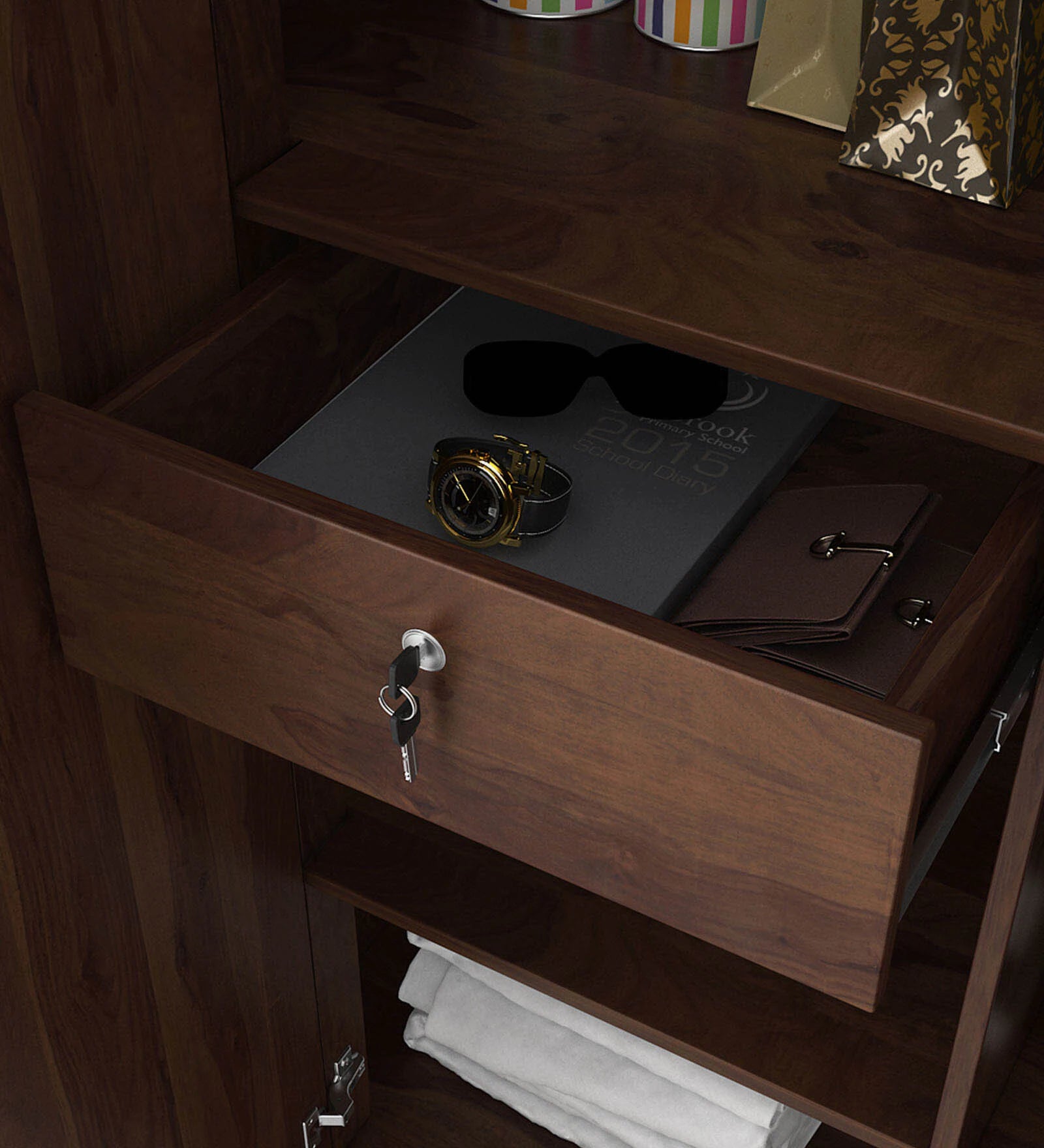 Spacious cupboard with a built-in drawer and secure locker, perfect for organizing your essentials while ensuring safety and convenience.
