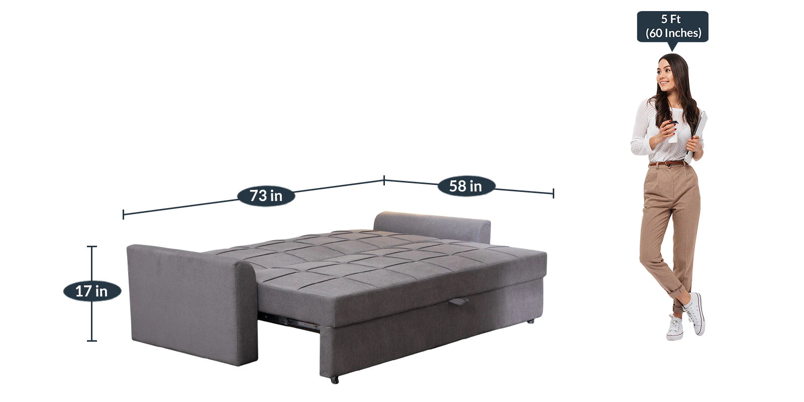 Dimensions (in Inches):- Sofa : H 37 x W 84 x D 35; Bed Size when open: H 17 x W 73 x D 58; Storage; H 9 x W 68 x D 23; Seating Height: 17; Seating Depth: 21